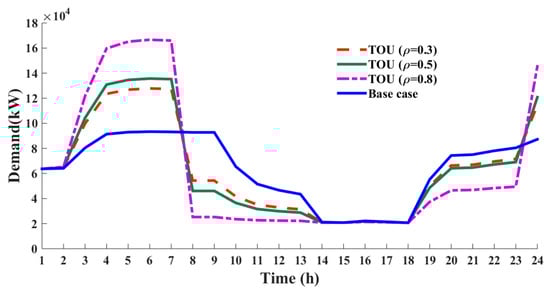 To get a better insight into the level of commitment in industrial DR programs over the work shifts, the load profiles are plotted in Figure 4 and Figure 5 for the different scenarios in Table 2. It can be observed that with the increase of ρ, the consumer’s wish to take part in DR programs, especially during the night shift, increased, as the price of electric energy is low. This effect is clearly illustrated in Figure 5 for each time interval.