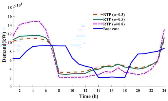 In Table 3 for a given α, an increase in ρ (and consequently consumers’ participation) led to a decrease in the budget, which reflects the consumer’s tendency to move towards more participation in the DR program. As mentioned and shown in Table 3, the total daily power consumption in the absence and presence of DR action remained the same and only shifted among different working hours.