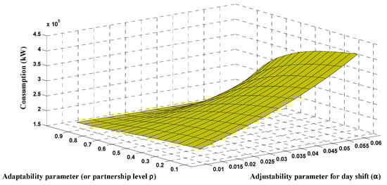 Changes in the day-shift consumption for different values of adaptability and adjustability parameters.