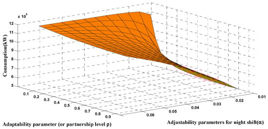 Changes in the night-shift consumption for different values of adaptability and adjustability parameters.