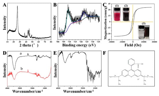 XRD (A), XPS (B) and VSM (C) images of magnetic porous carbon. (D) FT-IR spectra for magnetic porous carbon before (a) and after (b) adsorption. (E) FT-IR spectra for Rhodamine B. (F) The structure of Rhodamine B. Insert: Photos of (1) RhB solution, (2) RhB/magnetic bio-char mixture, and (3) resolution after magnetic separation.