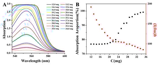 The effect of adsorbent dosage on the adsorption of RhB was investigated. It can be seen from Figure 3A that the absorption peak intensity at 550 nm decreased when the adsorption dose increased, and the peak disappeared almost completely after the treatment of magnetic carbon adsorbent with 34.8 mg, indicating the removal of RhB from the solution by the adsorption of the magnetic porous carbon as shown in Figure 2C. Figure 3B shows that the removal proportion of RhB increased with the increase in the dosage of adsorbent. This phenomenon was expected because RhB solution can obtain more interchangeable surface sites with the increase of adsorbent dosage [26]. However, the adsorption capacity of the adsorbent decreases gradually with the increase of adsorbent dosage. This is because the high solid content in one system will increase the probability of the collision among these adsorbent particles, resulting in their aggregations and decreasing the corresponding total surface area, thus being unfavorable for the adsorption behavior of magnetic carbon. The experimental results showed that the adsorption efficiency had a threshold. When the threshold value was reached, simply increasing the amount of magnetic porous carbon could no longer significantly improve the adsorption efficiency. For RhB, when the amount of adsorbent was between a and b, increasing the amount of adsorbent could effectively improve the adsorption efficiency. Therefore, the appropriate amount of porous carbon should be selected according to the initial concentration of RhB and the required absorption efficiency [27].