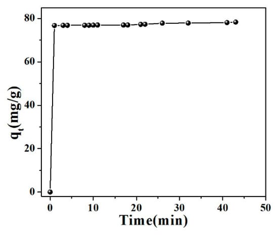 The effect of RhB solution on adsorption efficiency is shown in Figure 4. It can be seen from the result that the adsorption process was divided into two stages: Rapid removal rate and slow removal rate until the reaction was in equilibrium. The adsorption was basically balanced within 1 min, with nearly 76.8% removal efficiency of RhB, indicating that the adsorption process of RhB by magnetic adsorbent was extraordinarily quick and effective. This high efficiency was supposed to be mainly attributed to the resultant high specific surface area and the electrostatic interaction between the negatively charged surface of adsorbent and the positively charged RhB (as shown in Figure 2F).