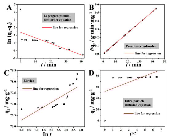 In order to evaluate the adsorption kinetics of magnetic carbon adsorbent on RhB solution, four models were used to fit the experimental data, as shown in Table 1. Assuming pseudo-first order kinetics, the rate of adsorption interaction can be calculated by Equation (a) in Table 1, where qt and qe are the amounts of RhB per unit mass at any time t and at equilibrium, respectively [28]. The constant k1 is the rate constant of the pseudo-first order kinetics, which can be obtained according to the slope of the simulated linear line in Figure 5A. The detailed calculated parameters are listed in Table 1 and the linear regression is presented in Figure 5A. It can be seen from Figure 5A that the data had a bad linearity (the red line is the linear fitting, and the correlation coefficient (r2) was 0.4886, which was less than 0.99). Therefore, it can be concluded that the adsorption process of RhB on magnetic carbon materials does not follow pseudo-first-order kinetics.