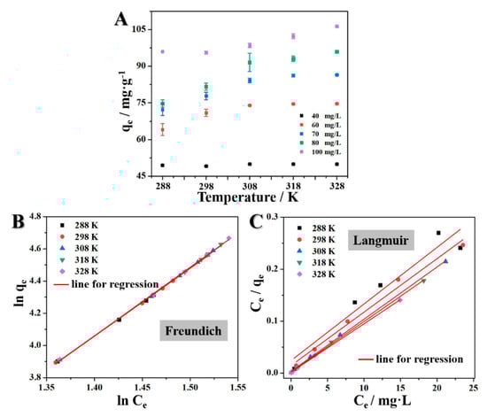 The effect of temperature on adsorption efficiency is shown in Figure 6A. As can be seen, the higher the temperature was, the more conducive it was to adsorption, implying that adsorption was an endothermic reaction.