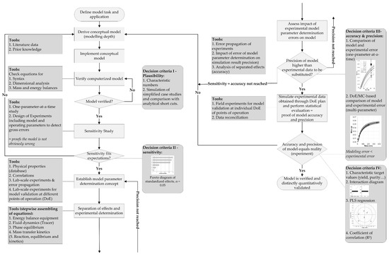 Initially, a model task and its application must be defined, from which a conceptual model is derived. The computerized model is verified by checking equations for syntax, dimensional analysis, as well as mass and energy balances. Subsequently, the first decision criterion is the comparison of characteristic numbers with literature data. Afterwards, the second decision criterion (sensitivity) is based on sensitivity studies. One-parameter-at-a-time as well as DoE (design of experiments) simulation studies are conducted to detect gross errors. A statistical data-driven evaluation of these studies generates a pareto diagram of standardized effects identifying significant parameters that have a major influence on the respective model. The third decision criterion (accuracy and precision) is based on the comparison of model and experimental errors. For this, a model parameter determination concept needs to be established. The determination concept consists of a separation of parameter effects, as well as an experimental determination and assessment of the impact of parameter errors on the process model, based on error propagation of experimental errors. The objective is to gain a process model with a higher precision than experimental data, which are to be substituted to reduce the experimental effort. In the end, the fourth decision criterion, which is based on simulated experimental data to prove model accuracy and precision, supported by statistical methods (i.e., partial least squares regression (PLS)), will result in a verified and distinctly quantitatively validated process model.
