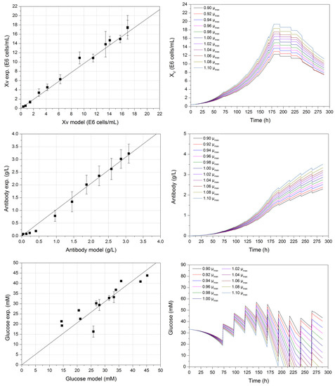 Correlation (left) between experimental and model-derived viable cell (R2 ≥ 0.98), glucose (R2 ≥ 0.97), and antibody concentration (R2 ≥ 0.99) with a maximum growth rate of 0.029 h−1. One-parameter-at-a-time studies (right) of the macroscopic model exemplified by varying the maximum growth rate ±10% of the experimental determined value.