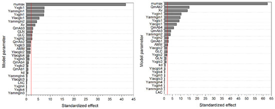 The Pareto diagrams (Figure 3) indicate significant model parameters, based on a level of significance (α) set to 0.05 (second decision criterion). Besides the maximum growth rate µmax, the yield coefficient YX/glc has a significant impact on the considered process variable (i.e., maximum viable cell concentration). YX/glc describes the ratio between generated viable cells (E6 cells/mL) and consumed glucose (mM). The higher YX/glc, the more cells can be generated during substrate uptake, as depicted in Equations (4) and (6). This results in a higher maximum viable cell concentration. The same correlation can be found considering YX/gln.