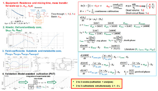Analog experiments can be used for validation. Furthermore, cultivations assisted by an online process model increase the gain in process information by integrating process data (e.g., turbidity) into the macroscopic kinetic model to extract information on process variables (e.g., glucose and lactate concentration) [11]. Efforts for the generation of this data are commonly 2 to 3 weeks for two to three simultaneously run cultivations in 1 to 2 L and their respective analysis.