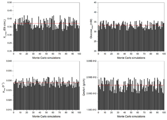 The impact of experimental model parameter determination error on the process model, based on error propagation of experimental errors, must be assessed to evaluate model precision. These errors depict maximal and minimal values for each model parameter. This variance can be included into a Monte Carlo simulation to determine the effect of model parameter errors on the process model. In this case, 100 simulations, varying each parameter equally distributed based on their experimental errors, were conducted. An example of the distribution of model parameters is given in Figure 5. As can be seen, the equally distributed process parameters result in maximum and minimum values for each considered parameter. The arithmetic mean of each parameter is depicted as a red horizontal line and corresponds to the model parameter value in Table 2 (e.g., 0.029 h−1 µmax). This analysis shows the influence of model parameter errors and their interactions among each other on the macroscopic kinetic model.