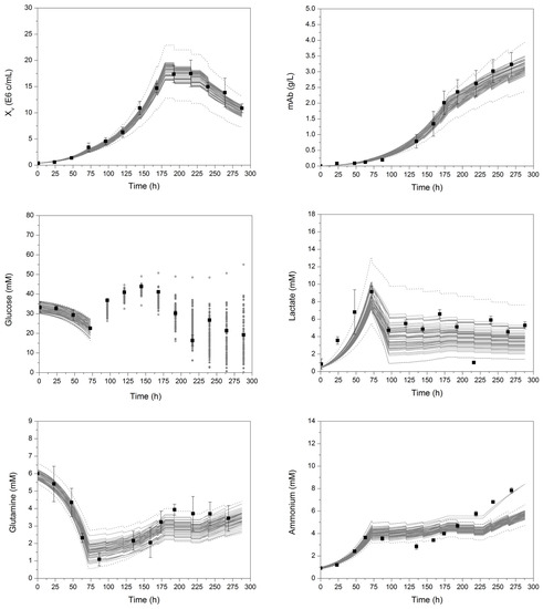 The Monod-type equations are based on limiting substrate and inhibiting metabolite concentrations, as seen in Equations (2) and (3). The higher the substrate concentration, the higher the growth rate µ, whereas higher metabolite concentrations limit cell growth by decreasing the growth rate. The apparent growth rate (µ minus µd) is thus dependent on substrate consumption and metabolite accumulation. These concentrations are simulated by Equations (4)–(8), where yield coefficients (e.g., YXv/glc) empirically describe the correlation between input and output variables. For example, YXv/glc correlates the variation in viable cell concentration (XV, E6 cells/mL) to the variation in glucose concentration (mM) during cultivation. Because of the dynamic behavior of a culture, yield coefficients can be quantitatively described by systematically defining cellular phases (i.e., lag, exponential, stationary, decline).