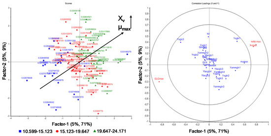The positive correlation of µmax on the maximum viable cell concentration (XV max) based on PLS analysis is shown in the score plot (Figure 8 left). The score plot identifies patterns in the samples, for example, by grouping responses and labeling predictors. The higher µmax, the higher the maximum viable cell concentration, yielding higher antibody concentrations, as seen in Figure 2 and Equations (1) and (9). Interestingly, the cell specific antibody production rate QmAb can be independently varied. This may be the result of low variations of this process model parameter.