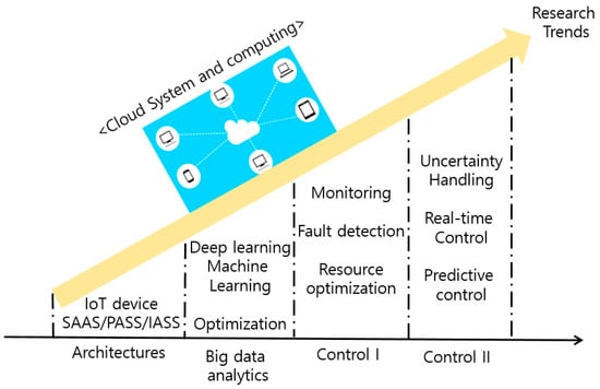 Figure 1 shows contemporary research trends in cloud computing and systems. While the existing cloud systems have been used for sharing data among the associated organizations, their main issues are in how the sharing data can be used for achieving several objectives. The initial relevant research studies examine the issues with the detailed architectures and their implementations. Then, cloud environments combine several analytics tools and intelligent methods. These tendencies indicate that the reasoning process and knowledge extraction are important prerequisite tasks for successful utilization of the constructed cloud system. Ikram et al. [] used a neural network for analyzing big data on a cloud platform. Many machine learning-based analytical methods including Support Vector Machine (SVM) [] and several heuristic algorithms [,,] are applied for reasoning knowledge as well as for managing domain-specific tasks for cloud systems. Then, the contemporary cloud system has been evolved with the integration with deep learning methods. Zhang et al. [] used a Canonical Polyadic Decomposition (CPD)-based deep learning model for predicting workloads in a cloud system. Roopaei et al. [] applied deep learning methods for managing large-scale cloud systems. These analytics are considered as big data analytics, as the data size in the cloud system is huge and its operational time is endless.