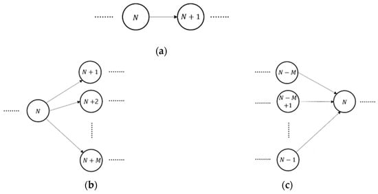 Several connection patterns among adjacent supply chain nodes: (a) serial linking; (b) split linking; and (c) merging linking.