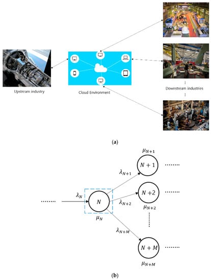 The data in the constructed cloud server were shared and analyzed using the previous analytics methods. In particular, the usage of MLP-DL method helped the reasoning between the process data and the quality data. It indicates that it is possible to predict current quality level with the real-time processing data in a supplier. As the supplier is in charge of the production of the key module for the following producers, the information is critical for achieving the manufacturing objectives in the downstream industries. This section elaborates on how the shared data and reasoned knowledge can be utilized for executing overall process plans dynamically. As shown in Figure 3b, the supplier and each downstream industry are represented with the Node N and the Node N+i , respectively. Then, each node’s (e.g., Node N) input rate () and service rate () are shared using the cloud server under the mutual contract. is estimated with the consideration of the number () of servers in the node. The manufacturing utilization in Node N is calculated using Equation (2).