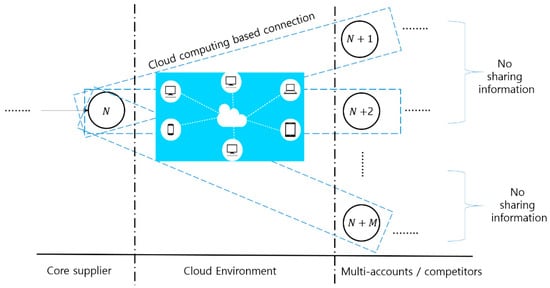 However, this research aimed at the control of a large-scale network where each node has different ownership and authentications. Several researchers including Chunha et al. [] stated that cloud computing and its environments enhance the independence of network elements due to the transparency of the information and relevant data. This paper focuses on the control of an independent node (a key supplier) using cloud computing. As shown in Figure 3a, each node has an objective and the relevant strategies. Thus, it is difficult to control all nodes with a unified objective. This issue occurs more frequently in a cloud environment connecting multiple sites and different companies. To overcome this issue, this paper proposes a new and effective control strategy of a node. The node attempts to achieve its objectives as well as to consider the requirements of the following downstream industries. As shown in Figure 3b, node N is considered a key supplier with its strategy. It is connected to a cloud environment where a predefined type of information and data are shared among the network elements. Then, its desirable strategy is proposed considering the dynamic requirements of the other nodes.