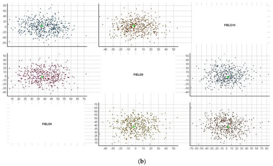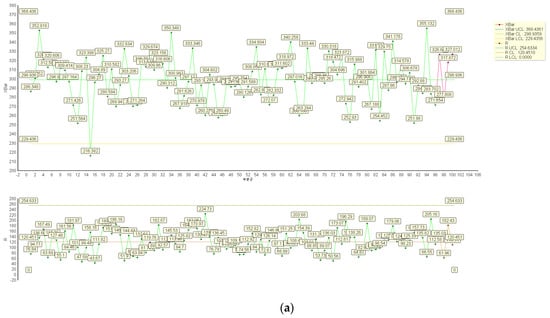 Figure 9a shows a generated control chart (-R control chart) of mold temperature data obtained using the installed temperature sensor. Figure 9b shows a matrix chart for depicting three mold setup orientations and the quality index where “1” indicates the product with accepted quality and “0” the module below the controlled quality. These data analyses are used for clarifying the correlations and dependencies among each signal type.