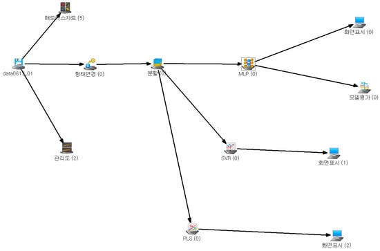 As provided in Equation (1), X is the input data matrix and Y indicates the quality index data where the data sizes were “11 × the number of analyzing dataset (= N)” and “1 × N” in this research. Then, the data dimension is reduced to the latent variable space using P and Q. The detailed parameters are provided in Table 4. SVR combines Support Vector Machine (SVM) and regression analyses. This research used ϵ-SVR model [] among various SVR models. The detailed parameters in this research are provided in Table 4.