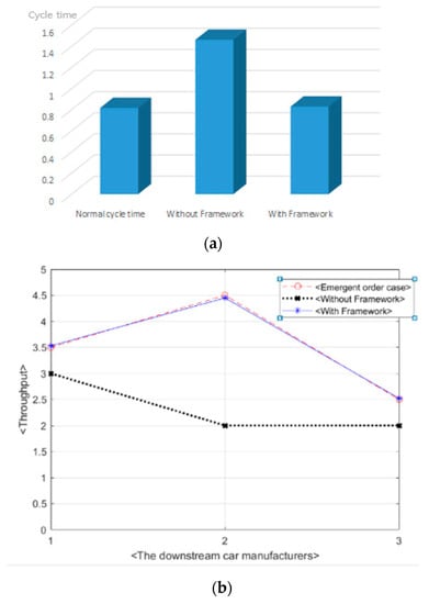 Scenario 3 supposed that the emergent orders are added from the customers. Then, these situations gave rise to the changes of (). The absence of the cloud system might cause difficulties with the information and the supplier tended to execute the existing process plan. As a result, it was difficult to meet the unexpected orders. However, the framework detected the changes and changed and to 10.45 and 12.6, respectively. Then, as shown in Figure 12b, the throughputs in the following downstream producers satisfied the emergent orders.