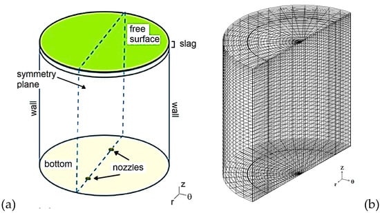 The no-slip boundary condition is applied to the bottom and lateral walls of the ladle. This condition means that the components parallel and perpendicular to each wall are at zero speed so that all components of the liquid and gas phases are zero [6]. A standard wall function is applicable since the near-wall flows are not expected to be subjected to severe pressure gradients [6,32]. At the free surface zero axial gradients (or zero fluxes) of all variables are set except for the mass of gas, which is allowed to leave the system when bubbles reach the free surface. At the symmetry planes located at 0° and 180° in the azimuthal direction, as well as at the symmetry axis, all fluxes are zero. Finally, at the gas inlet (for single plug gas injection) or inlets (for dual plug gas injection), a mass flow rate of gas is set at the nozzle positions located at the bottom wall of the ladle. Table 1 gives a full description of the boundary conditions, based on the geometry shown in Figure 1a.