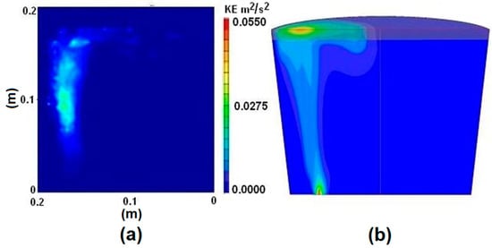 Model validation using turbulent kinetic energy data obtained by (a) particle image velocimetry (PIV) and (b) numerical simulation. The computational fluid dynamics (CFD) model results show a good prediction of experimental results.