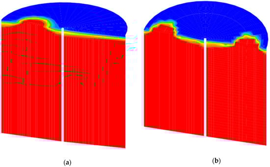 Steel–slag distribution (Steel, red phase; blue, slag phase) according to the mathematical model predictions considering the two cases in this study (a) single plug gas injection with nozzle at 1/3 R and (b) dual plug gas injection with nozzles at 2/3 R, observing a small numerical diffusion due to the use of a finer grid in the said interface, improving the degree of precision.