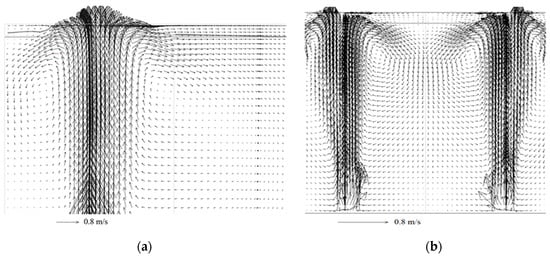 Velocity fields are shown in the plane of symmetry of the ladle furnace (a) single plug gas injection, the liquid metal shows two recirculation on the sides of the single nozzle, generated by the drag of the bubbles on the liquid steel, (b) dual plug gas injection creates two plumes with two circulating loops on each side of each plume. The flow patterns in the slag layer are different for both injections (single or dual).