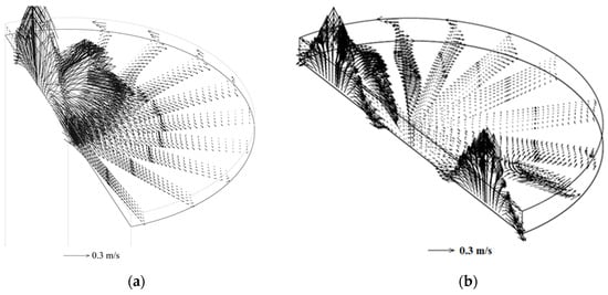 Velocity patterns: Flow velocities and turbulent kinetic energy contours were obtained experimentally using particle image velocimetry (PIV, Dantec Dynamics, Denmark) with one single nozzle located at 2/3 R. PIV equipment was manufactured by Dantec Dynamics® and operated in the single frame with a time interval between pulses of 100 μs and using 30% of the total power of the laser of 10 mJ. Images were captured with a High Speed camera SpeedSense M320 (Skovlunde, Denmark) with a resolution of 1920 pixels × 1200 pixels. A total of 500 pair of photos were captured and statistically processed with the software DynamicStudio version 4.0 (Skovlunde, Denmark) to get the final results on flow patterns and turbulent intensity. Additional details can be found in [33].