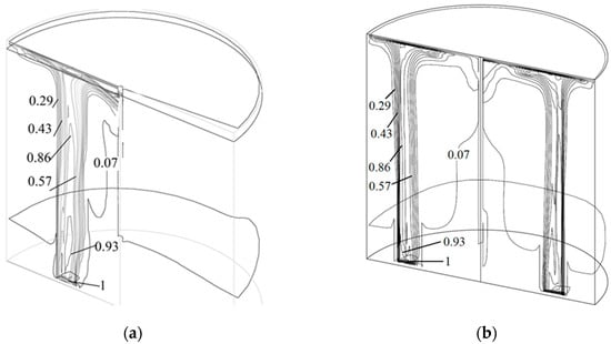 Figure 4 shows the two-liquid phase distribution in the ladle for both simulations. Only half of the ladle is shown due to symmetry. The two liquid phases are immiscible in each other and ideally a line should describe the interface. However, all mathematical models report some degree of error to represent an interface, called numerical diffusion. A finer grid around the interface, and higher-order convective schemes were used to mitigate the numerical diffusion. The results in this figure show that numerical diffusion is low, which is desired and is an indication of the accuracy of this model.