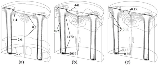 Dual plug gas injection (two nozzles) simulation: Gas-bubble characteristics in the system: (a) Weber number, (b) Reynolds number and (c) Slip velocity in m/s.