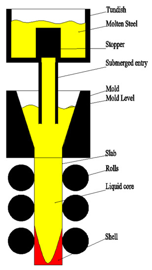 In the modern steel industry, high efficiency continuous casting technology has become the most internationally competitive core technology. The continuous casting process is a complex and continuous phase change process. There are many factors that affect the quality of slabs [1]. The research of the key technologies and cores in the high quality steel continuous casting process is mainly focused on mold level precision, the segment, and secondary cooling dynamic control [2].