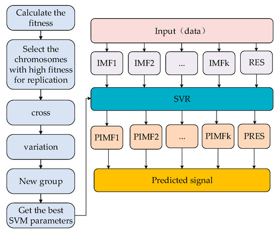 EMD is an adaptive decomposition algorithm, based on the original signal, which can decompose complex signals into simple signals. Obviously, the prediction of simple signals is simpler than the prediction of complex signals, and the calculation cost is small. SVR is an excellent predictive algorithm, especially robust to nonlinear signals. GA algorithm is used to optimize parameters of the SVR kernel function, which further improves the SVR prediction accuracy. In order to make full use of the above algorithms, we present a hybrid algorithm, in which the GA is incorporated into the SVR. In EMD-SVRGA, SVR is used to predict simple signals, which is decomposed by EMD, and the computational cost is greatly reduced. The GA algorithm optimizes the parameters of the SVR kernel function, improves the SVR calculation efficiency, and makes the hybrid algorithm achieve faster convergence speed. In addition, the adaptive characteristics of EMD and the robustness of SVR to nonlinear, non-stationary, non-Gaussian distributed signals further improves the generalization ability of the hybrid algorithm. The EMD-SVRGA algorithm can be described by the following steps as shown in Table 1, and the corresponding flowchart is shown in Figure 3.