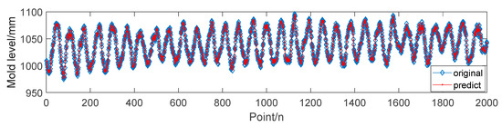In order to clearly express the applicability, superiority, and generalization capability of the model applications, the mold level data of actual process parameters are used in this paper. These were collected from the continuous casting machines developed by the China National Heavy Machinery Research Institute Co., Ltd., Xi’an, China. We used an eddy current sensor to collect the mold-level signal at a steady cast speed. The cast speed is 0.9 m/min, and the tundish temperature is 1562 °C. Most of the disturbances are non-linear and non-stationary, and the long-term predict model is difficult to establish. This paper presents mold level predict model is important for mold level control to propose new ideas to improve the continuous casting automatic control.