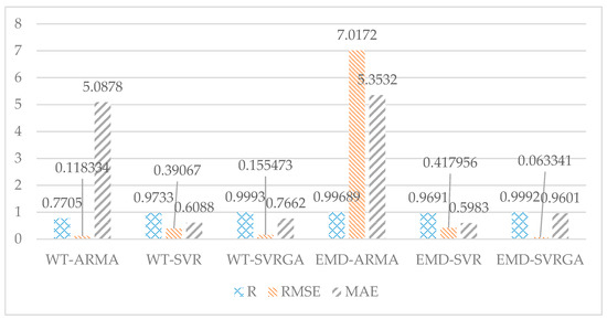 As shown in Table 5 and Figure 9, among the EMD based hybrid methods, the EMD-SVR had a better performance than EMD-ARMA, and EMD-SVRGA had better performance than EMD-SVR. Only the MAE is 0.9601, it is larger than the other methods. The other three indicators are all the best predictors of performance. Among the WT based hybrid methods, the WT-SVR had a better performance than WT-ARMA, and WT-SVRGA had better performance than WT-SVR, the performance of WT-SVRGA is the best, however, it is not stable. Only two indicators are better than the other two methods. RMSE is worse than WT-ARMA, and MAE is worse than WT-SVR.