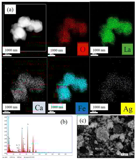 Typical TEM (a) and EDS elemental mapping and EDS spectra (b) and SEM image (c) of La0.8Ca0.2Fe0.94O3−δ + 0.05 Ag (LCFA) composite powder prepared by the EDTA–citric acid method (calcined at 900 °C).