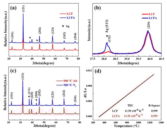 Figure 1 exhibits one typical TEM with the corresponding EDS elemental mapping and spectra of LCFA composite powder prepared at 900 °C. As can be seen from Figure 1a,b, the elements of La, Ca, Fe, O, and Ag are uniformly distributed in the composite particles with size around 100 nm. From the SEM image in Figure 1c, it is clear that the sintered powder is always agglomerated by these smaller particles. However, the presence of a very large agglomerate is unfavorable to the subsequent preparation of gastight perovskite hollow fiber membranes; thus, the sintered LCFA or LCF powder was further processed by milling and sieving to eliminate larger particles. Figure 2 depicts the room temperature X-ray diffraction patterns of the LCF and LCFA powder prepared at 900 °C from their complexing precursors. These powders were applied as the starting membrane material for hollow fibers. As can be seen from Figure 2a, LCF has a single-phase perovskite with cubic structure as evidenced by the characteristic diffraction peaks at 2θ of 22.92°, 32.51°, 40.16°, 46.98°, 53.24°, 58.06°, 60.08°, 72.96°, and 77.8°. By contrast, in addition to the major cubic perovskite phase, there are extra peaks at 2θ of 38.19° and 44.91°, which belong to the characteristic peaks (higher magnification in Figure 2b) of Ag metal phase. Noteworthy is that some unknown phases were detected at 2θ around 25°, 53°, and 54°. The crystal phase of LCFA was further studied in air and nitrogen using high-temperature X-ray diffraction (HT-XRD), with the result shown in Figure 2c. The comparison of these XRD patterns in room and high temperatures indicates that both the cubic perovskite phase and Ag metal phase are very stable without phase transition occurring despite the temperature alteration from room temperature to 900 °C and gas atmosphere change from air to nitrogen. Good phase stability is an excellent feature for LCFA to be applied as the membrane material, as the phase transition with the temperature change would induce stress possibly breaking the membrane [54]. Another parameter influencing the membrane’s physical integrity is its thermal shrinking/expansion behavior with the temperature change. The measured thermal expansion coefficients (TECs) (Figure 2d) of LCF and LCFA bar samples sintered at 1400 °C were 11.59 × 10−6 K−1 and 11.55 × 10−6 K−1, respectively, much smaller than other perovskite oxides of BSCF (24 × 10−6 K−1) [55], BCFSn0.1 (15.1 × 10−6 K−1) [56], and LSC (15.9 × 10−6 K−1) [53]. Ceramic membranes with smaller TEC values could also reduce the thermal stress during the heating–cooling cycling operation, helpful to maintain the membrane integrity.