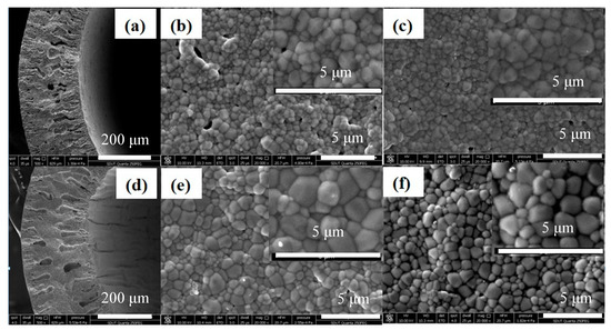 Typical SEM images of LCF and LCFA hollow fiber membranes (a–c) LCF; (d–f) LCFA; (a,d) cross section of fiber wall; (b,e) inner surface; (c,f) external surface (inset of (b,c,e,f) higher magnification; all magnification bar size at 5 microns).