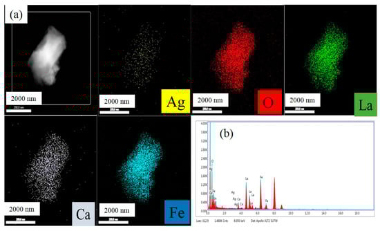 Typical TEM (a) and EDS elemental mapping and EDS spectra (b) of the LCFA powder crushed from LCFA hollow fiber membrane (sintered at 1250 °C; all magnification bar size at 100 nm).