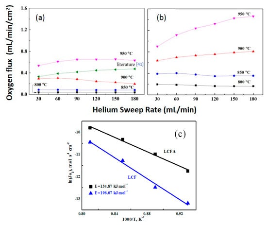 Oxygen fluxes at different operation conditions (a) LCF; (b) LCFA; and (c) Arrhenius plot; air flow rate 100 mL/min.