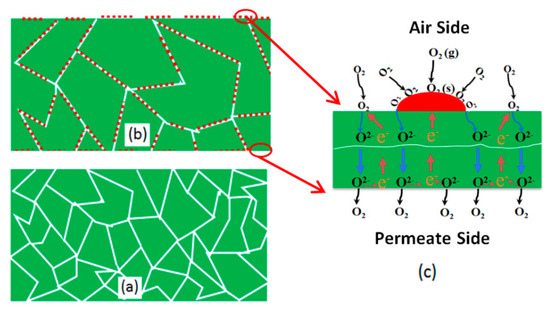 (1) Surface adsorption: Mass transfer of gaseous oxygen from the feed gas to be adsorbed on the membrane surface (air side) (Figure 6c).