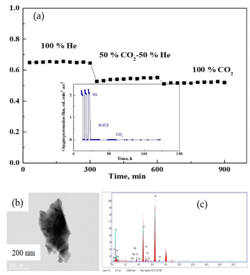 From industrial applications, the CO2-containing atmosphere is unavoidable for these perovskite oxide membranes; for example, even the feed gas–air has the trace content of CO2, thus understanding the permeation stability under CO2 atmosphere is important. For this purpose, oxygen permeation flux of another LCFA hollow fiber membrane at 900 °C swept by different gases in sequence with pure He, the mixture of 50% He + 50% CO2, and pure CO2 was investigated at 900 °C for 900 min with results presented in Figure 7a. Initially, under pure helium, the oxygen flux was 0.65 mL min−1 cm−2. When the sweep gas was switched from pure He to 50% CO2 + He, the oxygen flux was reduced to 0.54 mL min−1 cm−2. Swept by pure CO2 atmosphere, the flux was further decreased to 0.52 mL min−1 cm−2 for 100% CO2 atmosphere. This flux decay is mainly due to the strong surface adsorption of CO2 occupying the membrane surface oxygen vacancies, inhibiting surface oxygen desorption process [39]. Despite the minor flux decrease in CO2 atmosphere, the encouraging result is the good stability. Irrespective of the sweep gas containing 50% or 100% CO2, the oxygen flux was very stable. By contrast, the cobalt-containing perovskite oxide membrane of Ba0.5Sr0.5Co0.8Fe0.2O3−δ (BSCF) is featured by much higher fluxes under gas atmosphere without CO2; however, once pure CO2 was introduced, the flux of BSCF was immediately decreased to zero as shown in Figure 7a (the inset) from our previous result [41]. High stability against acid gases like CO2 at high temperatures will expand the applications of these LCFA perovskite oxide membranes for clean energy related projects like Oxyfuel combustion for CO2 capture in power plants. Figure 7b,c shows the TEM and EDS spectra of the tested LCFA hollow fiber membrane. As can be seen, after the long term permeation test, the five elements of LCFA, in particular Ag, are still present, which confirms the membrane stability.