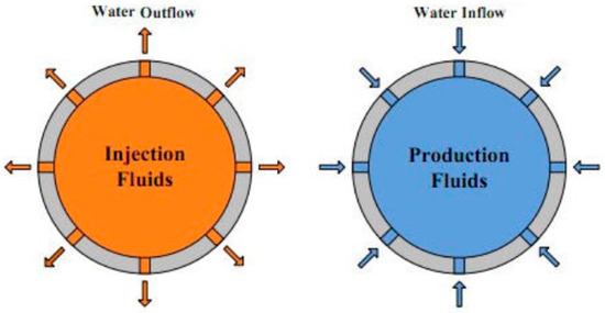 where T is the temperature, (ρcp)f is product of water density and water specific heat capacity, (ρcp)s is product of solid density and solid specific heat capacity. cp is specific heat capacity, kf is water heat conductivity, and the ks is solid heat conductivity. Because in this work the variation of reservoir pressure and temperature is very great and its influence on water density and viscosity is significant, we considered that the water density and viscosity are functions of pressure and temperature, as Equations (8) and (9). In this paper, the and the are calculated from steam table equations as given by the International Formulation Committee [44]. For more information about the state equations, the reader can refer to Reference [44].