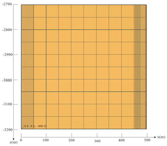 As stated above, in this work we mainly aim to exploit the heat stored in the fractured reservoir at a depth of 2700–3200 m and the distance between two adjacent production wells is 1000 m, as shown in Figure 1. Because of symmetry, only one quarter of the whole domain needs to be simulated, thus the actual calculated domain is 500 m × 500 m × 500 m. As shown in Figure 3, in the horizontal direction the grid that is within 50 m of the wells is refined, the width of every gridblock is 5 m and there are 10 gridblocks near the wells. For the other subdomain that is not near the wells, the 400 m length is evenly divided into 8 gridblocks, and the width of every gridblock is 50 m. Therefore, there are a total of 28 gridblocks in the x direction and the y direction. In the vertical direction, the 500 m height is evenly divided into 10 gridblocks, and the height of every gridblock is 50 m. With this grid arrangement, in the simulated domain there are total 28 × 28 × 10 = 7840 gridblocks. Based on Section 3.2, the reservoir domain is further divided into 5 continua for the MINC method, thus there are total 7840 × 5 = 39,200 gridblocks for the whole calculated domain. Under reference condition, we assumed that after hydrofracture, the fracture spacing is 50 m [32]. According to Pruess et al. [29], the conductive heat transfer between the impermeable cap rock or base rock and the permeable reservoir can be neglected for the fracture spacing of 50 m, thus in this work the conductive heat transfer between the confined rocks and the reservoir is neglected and only the heat transfer process within the reservoir is considered in this simulation. Assuming the surrounding rocks are impermeable, the water loss can be neglected [5], and the water injection rate qinj is equal to the water production rate qpro:qinj = qpro. Neglecting the water loss can greatly simplify the calculation of reservoir performance, and this has been adopted from previous studies by Zeng et al. and Xu et al. [4,5,32].
