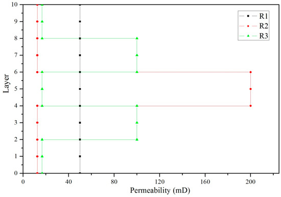 The permeability distribution pattern for the three cases: R1, R2 and R3.