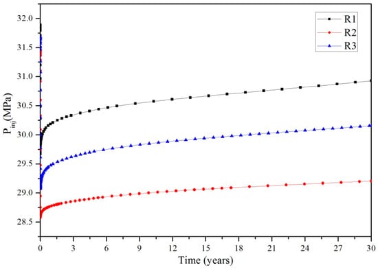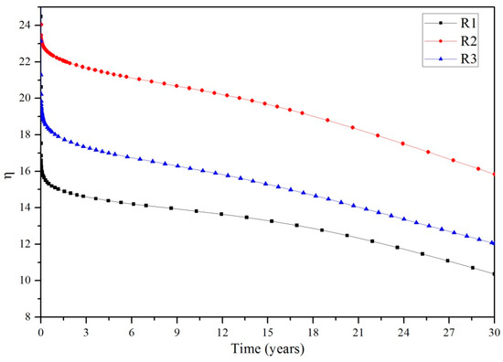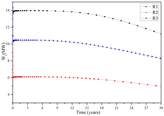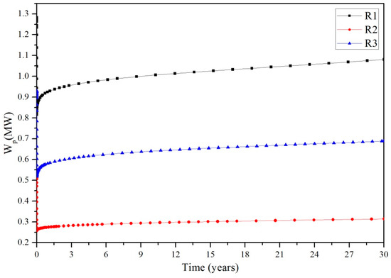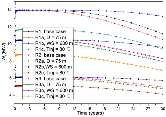 Figure 7 shows the change in electric power over 30 years under three reference cases. Based on previous studies, the change of the electric power of the EGS power plant can be divided into two stages: a stable stage and a declining stage [4,5]. During the stable stage, Tpro maintains an initial reservoir temperature and the corresponding electric power is also maintained unchanged; during the declining stage, the Tpro gradually declines and the corresponding electric power also gradually reduces based on Equation (11). It can be easily seen in Figure 7 that for the R1 reservoir, the electric power is highest, and over the 30 years, the gradually decreases from 13.97 MW to 11.20 MW. For the R3 reservoir, the is in between, and it gradually decreases from 10.45 MW to 8.29 MW. For the R2 reservoir, the is lowest, and it slowly reduces from 6.10 MW to 4.97 MW during the 30 years. According to Figure 6, the Tpro are very close in the three reference cases, thus the main factor affecting the is the water production rate q based on Equation (11). For the R1, R3 and R2 reservoir, the q is 40 kg/s, 30 kg/s and 17.50 kg/s, respectively. The q gradually decreases, thus the corresponding also reduces. This indicates that with the increase of the reservoir heterogeneity, namely R1 < R3 < R2, the water conduction ability of the reservoirs decreases, the corresponding water production rate reduces and the electric power declines. It is clear that during the reservoir stimulation stage, we should control the reservoir to be uniformly stimulated and make the permeability of every layer the same and this will greatly improve the water conduction ability of the reservoir and increase the electric power.