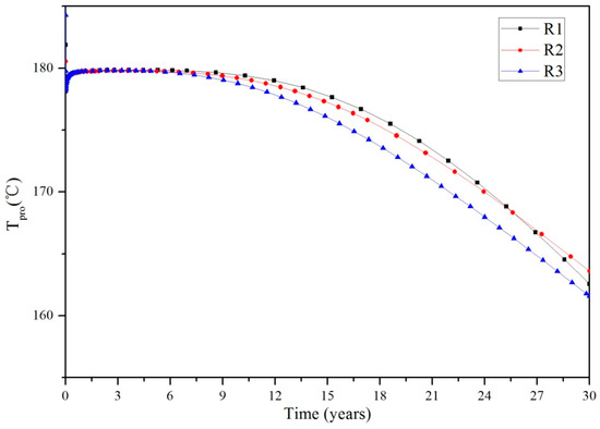 Change of the production temperature Tpro corresponding to the three reference cases.