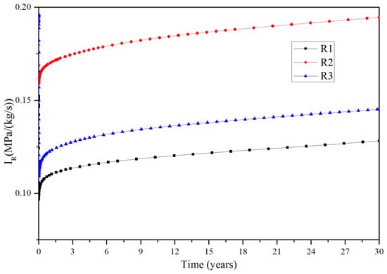 The water flow impedance of the system can be calculated as Equation (12), where Ppro = 25.80 MPa. In previous studies, Zeng et al. has analyzed the main factors influencing the flow impedance [4,5], and found that with heat mining the reservoir temperature gradually declines, the water viscosity slowly increases, and this causes the gradual increase of the reservoir impedance.