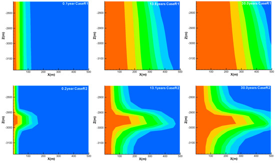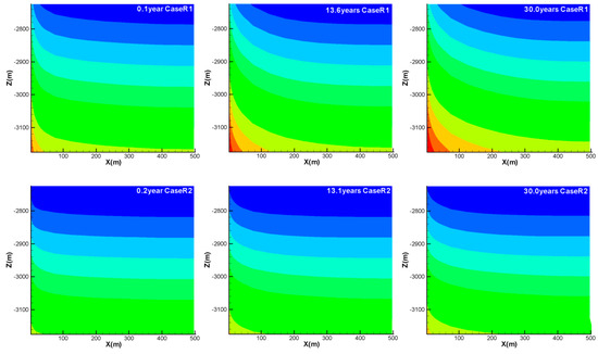 Figure 12 shows the evolution of the spatial distribution of the fracture temperature during the 30 years under the three reference cases. Annular low temperature regions gradually form near the injection well and the fracture temperature gradually increases from the injection well to the production well. With heat mining, the low temperature regions gradually expand, the reservoir temperature gradually declines, and this represents the result of the thermal energy in the reservoir being gradually extracted out. These are in accordance with previous studies from Zeng et al. [16]. Comparing the three reference cases, we find that a cold front forms in the high permeability layer of the heterogeneous reservoir. For the R1 reservoir, the temperature distribution of all the layers are basically identical and a cold front does not develop in which the temperature field is uneven. For the R2 reservoir, there forms one cold front in the two high permeability layers, because in these layers the water seepage velocity is much higher than that in the lower permeability layers. For the R3 reservoir, there forms two cold fronts in the four high permeability layers of the reservoir, also because the water velocity in these layers is much higher than that in the rest layers. These indicate that the reservoir heterogeneity has a significant influence on the fracture temperature field. In higher permeability layers, the water seepage velocity is increased, and there will form cold front, which means the temperature distribution along depth is uneven. The figure also shows that the system can benefit from buoyancy drive due to the temperature difference in the production and injection wells, and these are in agreement with studies from Huang et al. [42].