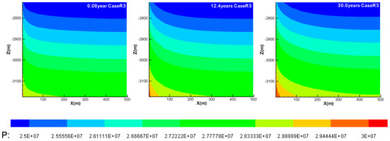 Evolution of spatial distribution of the fracture pressure (Pa) during the 30 years under the three reference cases.