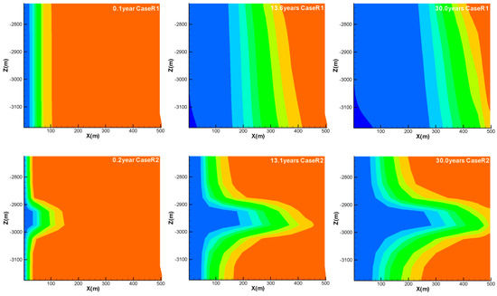 Figure 13 shows the evolution of the spatial distribution of the fracture water density over the 30 years under the three reference cases. Because near the injection well, it is high pressure and low temperature, annular high water density regions form. The water density reduces from the injection well to the production well. With heat mining, the high density regions expand toward the production well, the water density in the reservoir gradually increases, and this represents the result of the thermal energy being gradually extracted from the reservoir. Comparing the three reference cases we can find that in the high permeability layers there forms low density front, while in the low permeability layers the density distribution are basically even. For the R1 reservoir, the water density in each layer is basically identical, and a low density front does not form. For the R2 reservoir, there forms one low density front in the two high permeability layers. For the R3 reservoir, there forms two low density fronts in the four high permeability layers. As stated above, this is mainly because in the high permeability layers the horizontal velocity is much greater than that in the lower permeability layers, thus the low density contours are fronted in the high permeable layers. These indicate that the reservoir heterogeneity has a significant influence on the water density field. Higher permeability will increase the water conduction ability in the layers and there will form low density front, making the density distribution uneven along depth. This is in agreement with the studies by Huang et al. [42].